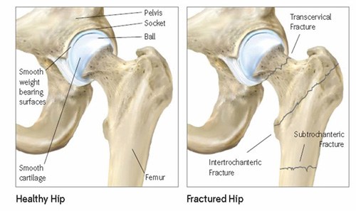 Most people break their hip near the upper part of the femur, usually where the thighbone fits into the hip joint. The type of surgery you will have and how long it will take to heal depends on where your fracture is located.