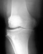 | The x-ray below shows a right leg with a degenerated medial (inside) compartment. Notice how there is no space between the femur and the tibia. This bone on bone contact can be quite painful. |